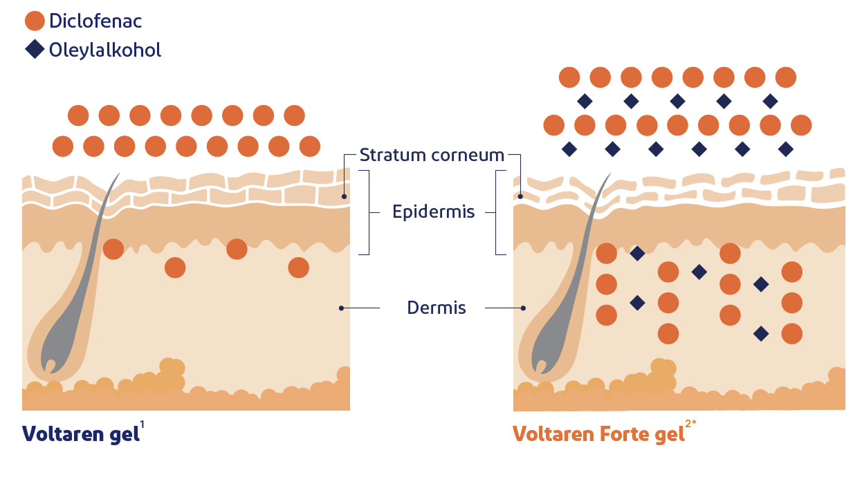 Voltaren Forte gel indeholder oleylalkohol, en penetrationsforstærker, der får den antiinflammatoriske diclofenac til at trænge hurtigere igennem huden2